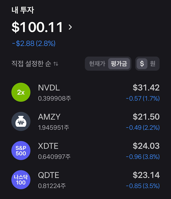 - 배당주 투입 : $21 (AMZY, QDTE, XDTE)